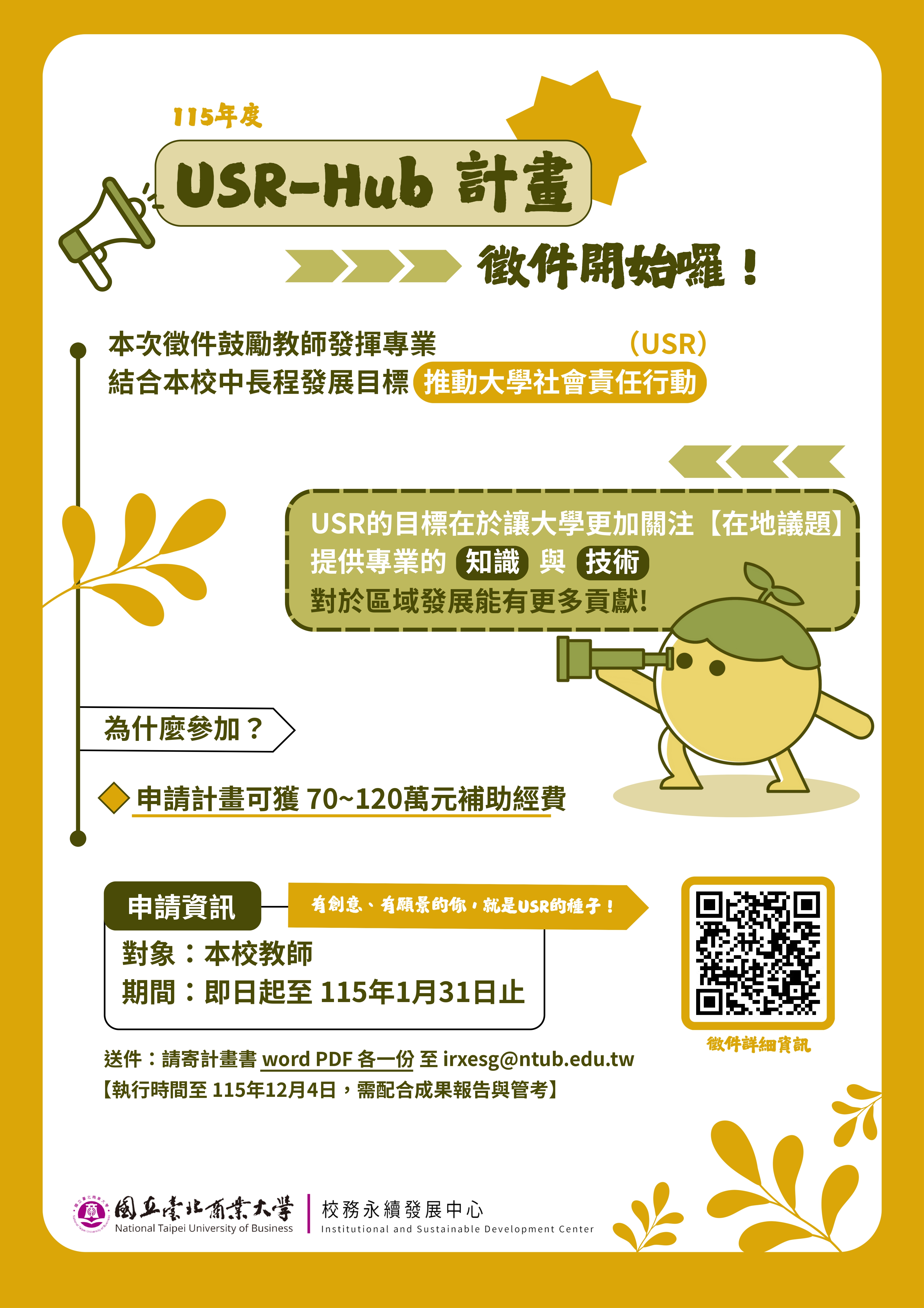 為配合教育部推動大學社會責任實踐(USR)政策, 並以申請教育部 萌芽型 USR 計畫 為目標, 辦理本校 115 年度「USR-Hub 種子計畫」徵件, 鼓勵教師發展具校務治理與社會影響力之行動方案。
